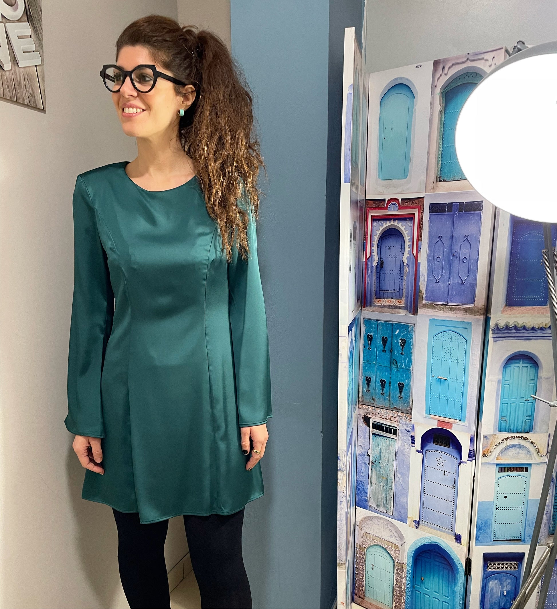 La sua struttura svasata crea un'aura di eleganza e raffinata femminilità, oblo' sul retro perfetto per un look sofisticato.