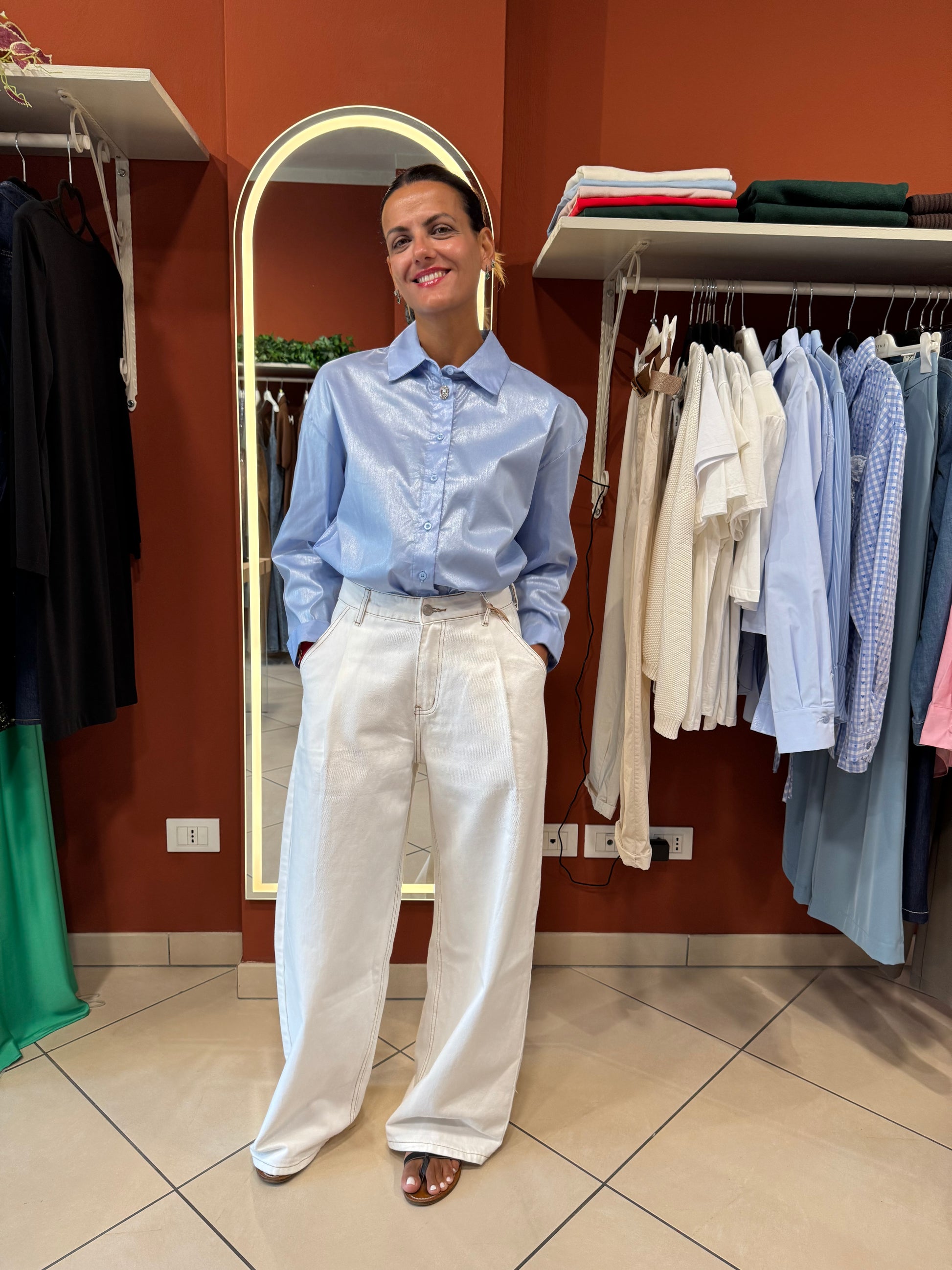 Denim a palazzo con pence , base burro e impunture color tortora.