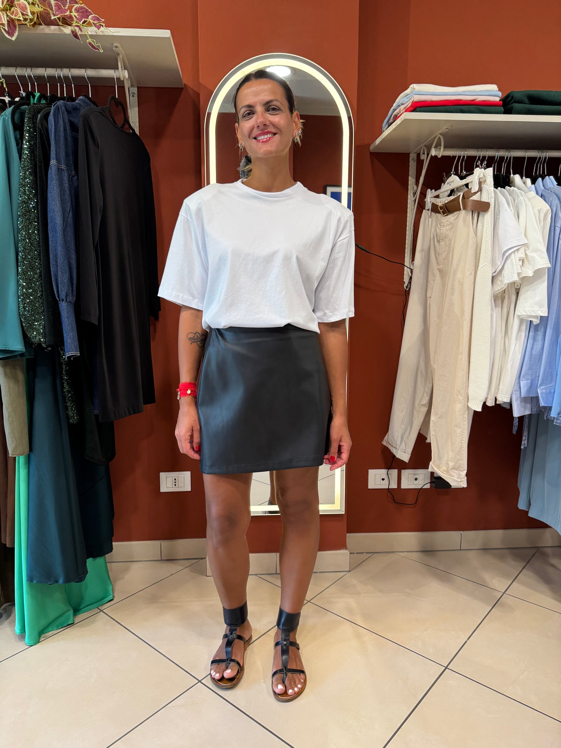 Scopri la nostra gonna in ecopelle , elegante e sportiva scegli tu come abbinarla .